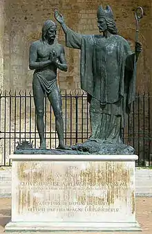 - 498, 25 грудня (Різдво)[21] — Хлодвіг прийняв хрещення у Реймсі разом із 3 тисячами вояків (якщо вірити словам Григорія Турського). Хрестив короля єпископ Ремігій, згодом проголошений святим. Перехід Хлодвіга у католицьку віру збільшив його вплив на галло-римські території, легітимізувавши його владу в очах місцевих християн. Однак водночас це був досить небезпечний захід, який зменшував популярність короля серед германців. Франки, як і всі германці, вірили, що король або вождь рівний богам, а католицька ж віра стверджувала, що вища влада належить Богу і Церкві на чолі з папою. Тому багато хрещених германців найчастіше були аріанами, оскільки згідно з цим віровченням, головою Церкви ставав не папа, а король.
