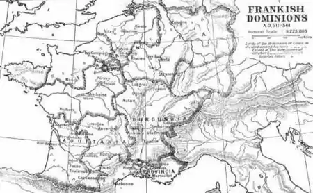 Після смерті Хлодвіга його сини Теодоріх, Хлодомір, Хільдеберт і Хлотар за франкською традицією розділили між собою королівство. У той час велика частина земель Галлії була підкорена, за винятком Провансу, Септиманії й королівства бургундів.