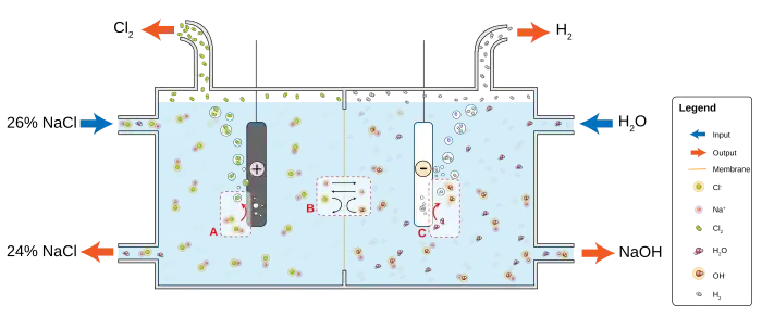 Катіони натрію і аніони гідроксилу весь час нагромаджуються в розчині і утворюють гідроксид натрію NaOH. Він реагує з хлором, що частково розчиняється в воді, утворюючи гіпохлорит та хлорид натрію