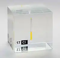 Позначається символом Cl (лат. Chlorum). Хімічно активний неметал. У природі існує два стабільних ізотопи: 35Cl i 37Cl. Науковцям вдалось синтезувати нестабільні ізотопи хлору, зокрема, з атомною масою 52[2][3].
