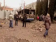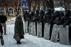 ![]() Бабуся біля «Беркуту», який заблокував прохід на вул. Гагаріна |