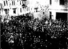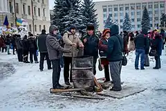 ![]() Чоловіки біля бочки на майдані Незалежності |