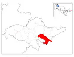 На півдні знаходяться гори Чилустун та Кірташтаг, що входять до Алайського хребта. Найвища точка — 1 457 м. На північному заході — адири. Інша частина — низовина.