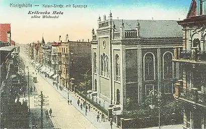 - Pocztówka – Królewska Huta (Chorzów), widok na synagogę przy Kaiserstrasse (ul. Wolności), reprodukcja pocztówki z 1910 roku // Сілезький музей (Катовиці)