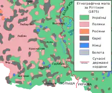 За етнічною ознакою у державному переписі населення Холмщини 1909 р. окремо українців і росіян не виділяли, а відносили обидві "народності" у спільну рубрику "руських". Але, як вважали Мирон Кордуба[7] та Іван Крип’якевич[8], кількість росіян на цій території була незначною[9]. За результатами перепису населення Холмщини і Підляшшя, опублікованими у 1912 р., тут проживало 463 901 чол., які назвали своєю розмовною мовою “руську”, і 268 053 — польську. Згідно з результатами перепису, в чотирьох повітах Холмської губернії з восьми українці і росіяни становили абсолютну більшість: у Константинівському повіті — 43 139 чол. (70,82 %), Влодавському — 64 987 чол. (64,97 %), Більському — 54 517 чол. (60,48 %), Грубешівському — 79 404 чол. (57,31 %). Польське населення мало абсолютну більшість лише в Замостському повіті — 47 910 чол. (52,36 %). Отже, у 1912 р. в Холмській губернії було українців і росіян — 463 901 чол. (51,76 %); поляків — 268 053 чол. (29,9 %); євреїв — 135 238 чол. (15,1 %); представників інших національностей — 29 123 чол. (3,24 %)[10][9].