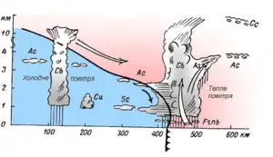 - Холодний фронт першого роду, коли холодне повітря наступає повільно,