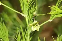 Багаторічна рослина 40–100 см завдовжки. Кладодії (зелений асимільований пагін, сплющений, який виконує функцію листка) (по 10–20 у пучку) дуже тонкі, волосоподібні, 0.1–0.3 мм діаметром, досить довгі (до 30 мм довжиною). Квітки на довгих тонких квітконіжках, зі зчленуванням трохи нижче верхівки[2]. Стебло та гілки гладкі. Сегменти зовнішньої оцвітини (5)6–8 мм. Пиляки 0.4–0.5 мм. Ягоди 10–16 мм діаметром, червоні, з 2–6 насінням[3].