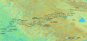 Перше поселення після після Багдаду було Нахраван або Джиср Нахраван ("Міст через Нахраван"), найменоване на честь магістрального каналу Нахраван, який проходив скрізь нього. За часів Аббасидів це було процвітаюче місто, але було покинуто і зазнало руйнації, коли шлях попрямував північніше через Баакуба. Навколишній район був відомий як Тарік-і-Хорасан (Ṭarīq-i-Khurāsān) через Хорасанський шлях.[4] Наступне місто було відоме у арабів як Даскара аль-Малік («Даскара короля»), і ототожнюється з Дастагірдом часів Сасанідів. Далі була Джалаула, біля якої було побудовано великий міст, часів Сасанідів, через річку Діяла, ще далі був Ханакин, де також був великий міст і Касре-Ширин, ("Замок Ширин"), найменовано на честь дружини Сасанідського шаха Хосрова II.[5] У Гулван, шлях покидає Месопотамську рівнину і прямує горами Загрос у провінції Джибал[6] Далі шлях прямує до Мадгарустану, Гулванським перевалом через місто Керенд і село Хушан. Далі на Тазар або Каср Язид і аль-Зубайдія, де шлях повертає на схід до Керманшаха по рівнині Махідашт. У більшості з цих населених пунктів, мусульманські географи реєстрували присутність руїн сасанидських палаців[7] З Керманшаху дорога прямувала до Хамадан і Саве, потім повертає на північ до Рея, і звідти через перевал до провінції Куміс[8]. Дорога була головною життєвою артерією Куміс, і більшість міст провінції були розташовані уздовж її маршруту: Хувар, Каср або Каріят ель-Мільх ("Соляний замок"), Рас-ель-Кальб ("Голова собаки", ототожнюють з Ласджердом), Семнан, Дамган, аль-Гаддадаг ("Кузня") або Мігман-Дуст, і Бістам. Біля Бістаму, у села Бадгаш, дорога входить до Хорасану[9]