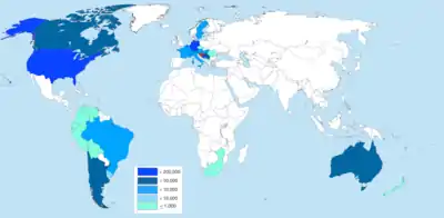 - La Croatie: Population et religions [Croatia: Population and religions]. Embassy of Croatia in France (фр.). Архів оригіналу за January 2, 2011. «Plus de 2 millions de Croates (originaires de Croatie et de Bosnie-Herzégovine) vivent à l'étranger. Dans la deuxième moitié du XIXe siècle de nombreux Croates ont émigré sur d'autres continents. Leurs descendants sont aujourd'hui 1,3 million aux États-Unis, 150 000 au Canada, 250 000 en Australie. Plus récemment, beaucoup sont partis vers l'Europe occidentale, principalement l'Allemagne où ils sont 280 000, l'Autriche 40 000, la Suisse 35 000, la France quelque 30 000. [TRANS] More than 2 million Croats (originating from Croatia, Bosnia, and Herzegovina) live abroad. In the second half of the nineteenth century many Croats emigrated to other continents. Their descendants are now number 1.3 million in the United States, 150,000 in Canada, and 250,000 in Australia. More recently, many have gone to Western Europe, mainly Germany where there are 280,000, Austria 40,000, Switzerland 35,000, and France some 30,000.»