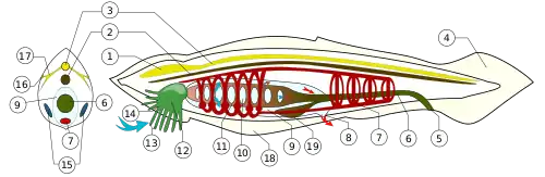 - Передній відділ кишки (глотка) у зародків пронизана зябровими щілинами, які зберігаються протягом життя у нижчих та риб і замінюються у процесі розвитку у вищих на легені[2]. У нижчих хордових беруть участь в фільтрації води задля харчування. У наземних хребетних зяброві щілини закладаються в ранньому ембріогенезі у вигляді зябрових мішечків.