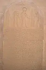На першому рельєфі зображено фараона, що тримає на плечі бойову сокиру. Він приймає від Амона-Ра символ божественного життя; йому дається, крім того, влада підпорядкувати собі північ і перемогти південь. Внизу лежать нубійці, одні повалені на землю, інші простягають з благанням руки свої до єгиптянина, який веде їх, і який, судячи з бічного напису, дорікає їм, що вони замкнули серце своє мудрості і що вони не чули, коли їм повідомляли: «дивись, он лев, який вторгся в землю Куш» .