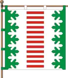 Квадратне полотнище розділене вертикально сосновогілкоподібно на три смуги — зелену, білу, зелену — в співвідношенні 1:6:1. На білій смузі згори донизу розташовані дванадцять червоних укорочених прямокутників.