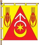 В жовтому квадратному полотнищі від нижніх кутів до середини верхнього пруга виходить червоний трикутник, на якому жовта шестипроменева зірка, супроводжувана вгорі білою половиною дуги, завершеної стрілою, внизу жовтим горизонтальним півмісяцем ріжками догори. На жовтих частинах по червоному вертикальному колоску.