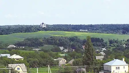 Край Хотівського городища. На задньому плані видно вал, а під ним праворуч — зовнішній край рову. Фото 2009 р. (наступного року ця частина городища була знищена будівництвом маєтку).