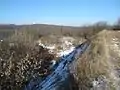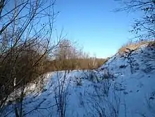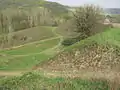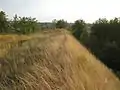 Ділянка, що в центрі попередньої світлини, зблизька (фото 2009 р). Видно вал та рештки рову, що заплив землею (по зовнішньому краю рову йде стежка).