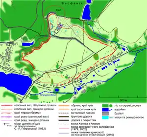 - Додаток 2. План городища раннього залізного віку у с. Хотів із межами пам'ятки, охоронної зони і зазначенням геодезичних реперів. Інститут археології НАНУ, 2016.