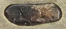 Найцікавішою є знахідка кістяної пластинки, на залощеній поверхні якої вирізано фігурку пантери чи барса з підібраними лапами у скіфському звіриному стилі. Розмір пластинки — 4,7x1,8 см, це могла бути частина руків'я дзеркала, ложки або іншого предмета. Вона була знайдена 1965 року в заповненні землянки на глибині 1,5 м (на місці, де зараз розташований південно-західний кут території палацу)[13][36]. Судячи з супутньої кераміки та вістер стріл, знахідка належить до кінця VI ст. до н. е. На території Скифії знайдено ще тільки одне зображення хижака в такій позі на кістяному предметі (хоча на металевих вони трапляються частіше).[19]