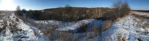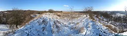 ![]() Вид з півдня на Хотівське городище та Свято-Пантелеймонівський собор у Феофанії (фото 2016 р.) | ||||
