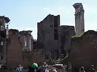 Храм, перебудований за перших імператорів, був періптерічним октастилем з коринфським ордером і мав по 11 колон з довгих сторін і подвійні рядки колон з боків порівняно неглибокого пронаоса. Подіум дуже високий, основа храму майже на 7 м вище рівня Священної дороги. Пронаос заглибжки 9,9 м і завширшки 15,8 м; целла заглибжки 19,7 м і завширшки 16 м; вся будівля має приблизно 50 м завдовжки і 20 м завширшки. Бетонний подіум містить в собі залишки попередніх фаз, включені в туфові стіни, від яких відходять контрфорси, утворюючи камери (loculi) для зберігання цінностей. Опори колон побудовані з травертину, а не з туфу. З пронаоса 11 сходинок ведуть вниз на ростри перед фасадом храму, розташовані на висоті 3,66 м над рівнем вулиці. Ростри мали перила і могли вмістити досить багато людей. Від надбудови до XV ст. залишилися 3 колони зі східного боку, бо територія поруч з ними називалася «Три Колони» (Tre Colonne). Вони виготовлені з білого мармуру, заввишки 12,5 м, і мають антаблемент з простим фризом і розкішним карнизом з модільонамі. Капітелі колон відрізняються особливою пишнотою.