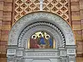 Храм побудований з червоного і жовтого травертину. Стіни тришарові — камінь, залізобетон і цегла. Куполи покриті бляхою золотого кольору.