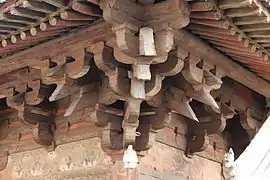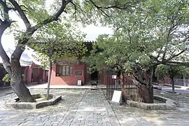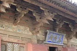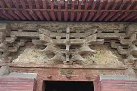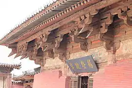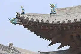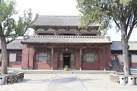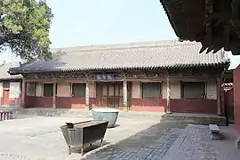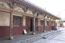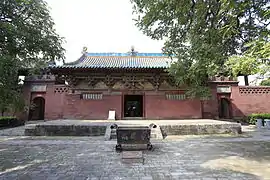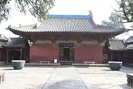 ![]() Зал Ваньфо храму Чженьґуо. Вкритий черепицею дах декоровано невеликими, багато прикрашеними драконами. Є одні двері до обкладеного цеглою двору Зал Десяти тисяч Будд (万佛殿) храму Чженґуо | |