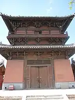 Головна брама (кит.: 山门; піньїнь: Shān Mén) — це великий зал, що було збудовано за династії Цзінь у 12 столітті, він слугує входом до храму.[18] У залі містяться статуї чотирьох небесних королів, два на східній стороні, два на західній.[18] У довжину він п'ять травей, дві в ширину, що охоплює площу в 278 квадратних метрів.[19] Кронштейни, що використовуються для підтримки структури — п'ятого рангу.[20]