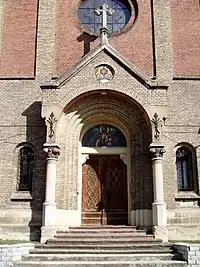 Збудована церква з цегли червоного і жовтого кольорів, із застосуванням кам'яних елементів, зовні нетинькований. Зорієнтований на осі північ-південь. З обидвох боків примикають монастирські корпуси. За плануванням це однонавова базиліка. Нава квадратна в плані, перекрита одним хрестовим склепіння. Ребра склепінь опираються на високі півколони із кубічними романськими капітелями. В бічних стінах нави влаштовано по одному вікну із півциркульним завершенням. З обох боків нави влаштовано входи до каплиць, що примикають до церкви. Перша — св. Франциска (східна сторона), друга — св. Йосафата (західна сторона). Нартекс однопрясловий, коротший від нави, піднесений відносно неї на одну сходинку. У ньому влаштовано емпору, під котрою знаходиться невеликий передсінок і два бічні проходи ведуть до східного і західного крил монастиря. З півночі від нави — презбітерій, дещо вужчий за наву, піднесений відносно неї на одну сходинку, перекритий одним пряслом хрестового склепіння. Після презбітерія — двопряслова абсида, що виходить у внутрішній двір. Фасад костелу двоярусний із трикутним фронтоном виступає назовні у вигляді ризаліту монастиря. Фронтон увінчаний кам'яним хрестом (хрест втрачено), а краї — кам'яними вежечками. Другий ярус розділений лізенами із жовтої цегли на три поля, при чому центральне поле значно ширше за бічні. На другому ярусі влаштовано кругле вікно, а над ним, у півциркульно завершеній неглибокій ніші — група з трьох вузьких вікон, з котрих середнє — вище за бічні. Портал церкви має власний трикутний фронтон, увінчаний хрестом, опертий на двох колонах з капітелями з рослинного орнаменту. В середині фронтону — півциркульна арка зі ступінчастим профілем. Над аркою в круглій ніші зображення монстранції з ангелами. Вхід звичайний прямокутний, над ним тимпан із мозаїковим зображенням Спасителя із написом ІС ХС. Дах над нартексом і презбітерієм і абсидою — двоскатний, над навою — наметовий, вкритий шифером. Дах над навою увінчаний восьмигранною, оббитою бляхою, вежечкою із витягнутим гострим завершенням із хрестом. Подібна, дещо менша вежечка увінчує дах абсиди.
