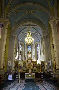 Головний вівтар в неороманському стилі з монументальним балдахіном і високою перегородкою був встановлений у презбітерії, майже посередині церкви. Виконаний з мармуру і алебастру у львівській фабриці кам'яних виробів Леопольда Шимзера. Проєкт належав Юліану Захаревичу і був модифікований Леонардом Марконі під час виготовлення гіпсових моделей для майстерні Шимзера. Роботи фінансувались родиною князів Ліхтенштайнів з Відня. Різнокольорове світло, що проходило крізь вітражі, попадало на вівтар ззаду, і частково проходило крізь алебастр, надаючи вівтарю незвичайного вигляду. У вівтарі вміщено дерев'яне розп'яття другої чверті XVIII ст.