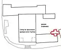 Схема розташування давньої церкви в середовищі єзуїтського комплексу.[lower-alpha 2]