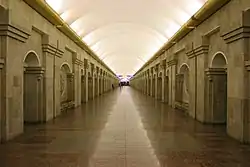 Колійні стіни оздоблені травертином, арки, колони і простінки — вапняком. Тринавний підземний простір станції має традиційну доричну ордерну систему, стилізовану, укрупнену об'ємно. Торцева стіна вперше в Росії оздоблена дзеркалами, що візуально подовжує перон. Також вперше використовується римське позначення дати відкриття на фризі фронтону, відокремленого від арки в торці. Підлога з полірованого граніту оздоблена темно-червоними квадратами на сірому тлі. Застосовано закарнізне освітлення станції.