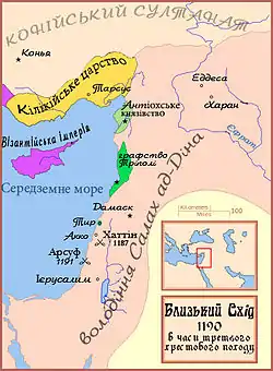 В 1187 р. султан Саладін (Салах ад Дін) розбив хрестоносців і захопив Єрусалим. Відбивати святе місто у третьому поході вирушили зі своїми військами король Франції Філіп II Август, король Німеччини Фрідріх I Барбаросса і король Англії Річард I Левине Серце.