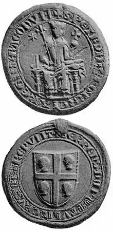 | Щит | У сріблі червоний хрест з чотирма головами мавританських королів у чвертях |