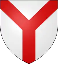 Вилоподібний хрест виникає шляхом з'єднання половини стовпа з половинами двох перев'язів: однієї справа, а інший ліворуч, сходяться в середині щита. Виходить фігура у вигляді латинської літери Y, за що хрест подібної форми часто називають Y-подібним. Вилоподібний хрест зустрічається і в перевернутому вигляді - в цьому випадку він описується як перекинутий вилоподібний хрест. Існує і так званий повний вилоподібний хрест (який має альтернативну назву «стояк»), що являє собою варіант вилоподібного хреста, у якого простір між верхніми раменами зафарбовано тим же кольором, що і сам хрест. |