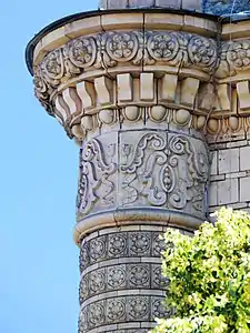 Горизонтальне членування досягнуто за допомогою рельєфних керамічних вставок, розміщених під вікнами, карнизу з орнаментованою кімою та зубцями й парапетом із балюстрадою.