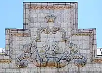 Над портиком — балкон. Завершує фасад східчастий фронтон, оздоблений зображенням сонця в картуші[1].