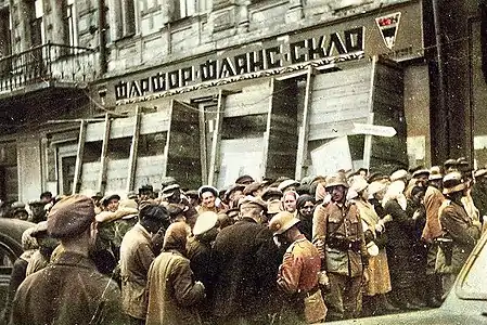 1941 року радянські диверсанти перед відступом у будинках на Хрещатику заклали вибухові пристрої. Коли німці увійшли до міста, вони пристосували приміщення кінотеатру під комендатуру, а в сусідній крамниці «Дитячий світ» (№ 28/2) розмістили штаб 454-ї німецької охоронної дивізії. Окупаційна влада наказала киянам прийти в комендатуру на реєстрацію. Мешканці кілька днів змушені були стояти у черзі. 24 вересня стався потужний вибух у будівлі № 28/2. Від детонації спрацювала також вибухівка у кінотеатрі. Будівля була повністю знищена. Пожежа перекинулась на весь Хрещатик[7][8].
