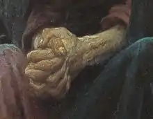 Стриманість у зображенні одягу дозволяє художнику надати основного значення обличчю та рукам Христа, які створюють психологічну впевненість і людяність образу[13]. Міцно стиснені кисті рук розташовані практично в самому геометричному центрі полотна. Разом із обличчям Христа вони представляють собою смисловий і емоційний центр композиції, який притягує до себе увагу глядача[28]. Зчеплені руки, розміщені на рівні лінії небокраю, «в судомно-вольовому напруженні ніби намагаються зв'язати, подібно замковому каменю, весь світ — небо та землю — воєдино»[48]. Босі ноги Христа зранені від довгого ходіння по гострому камінні[13].
