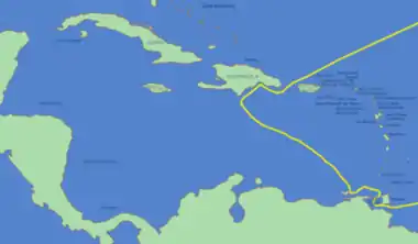 Друга експедиція вирушила 25 вересня 1493 з Кадіса. На Канарських островах взяли цукрову тростину і собак, спеціально привчених до полювання на людей. Цього разу Колумб вирішив рухатися південнішим маршрутом, і тому вже через 20 днів досяг берега поблизу Малих Антильських островів. 3 листопада 1493 (в неділю) відкрив острів Домініка, 4 листопада експедиція прибула до найбільшого з тутешніх островів, названого Ґваделупа. На відкритих островах жили кариби, які здійснювали на великих човнах набіги на острови мирних араваків. Зброєю їх були луки і стріли з наконечниками з уламків черепахових панцирів або зазубрених риб'ячих кісток.
