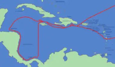 29 червня 1502 року, рятуючись від шторму, попросив у намісника Еспаньйоли Ніколаса Овандо дозволу сховатися в гавані Санто-Домінго, але йому було відмовлено. На щастя, кораблі Колумба впоралися з бурею. У липні Колумб вирушив на захід уздовж південного узбережжя Еспаньйоли та Ямайки. Він мав намір дійти на заході до материка і відшукати протоку, рухаючись уздовж берега.