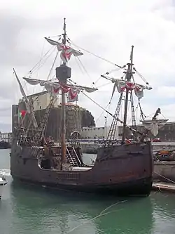 Будучи переконаним, що Азії можна досягти, пливучи на захід, він заручився підтримкою іспанського короля Фердинанда ІІ Арагонського та королеви Ізабелли І Кастильської. 22 травня 1492 року Колумб прибув у порт Палос, у якому, відповідно до королівського указу, повинен був отримати дві каравели. Місто дало йому для використання каравели «Пінта» та «Нінья». Судна мали близько 20 м завдовжки і 7 м завширшки. Як флагманське судно Колумб орендував у Хуана де ла Коси великий корабель «Санта Марія».