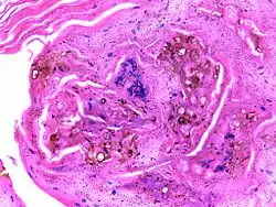 ![]() Мікрографія препарату при хромомікозі, що демонструє вогнища склерозу Мікрографія препарату при хромомікозі, що демонструє вогнища склерозу | |