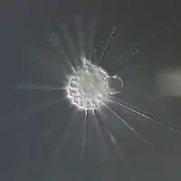 ![]() Сонцевик Actinophrys З'являються клітини, які містять ядро — еукаріоти.[25][26] Еукаріотична клітина містить органели, які виконують різні функції і оточені мембраною. За теорією симбіогенеза, деякі органели, наприклад мітохондрії або хлоропласти (що грають роль «живих електростанцій», виробляючи АТФ) виникли від прокаріотів шляхом симбіозу. Спочатку ці органели були окремими організмами, симбіонтами, які співіснували з іншими клітинами і допомагали здійснювати їм деякі функції[27]. Згодом вони були захоплені своїми господарями, поступово втратили здатність до самостійного існування і перетворилися на органоїди (органели). Перехід клітин до виробництва енергії з використанням мітохондрій став еволюційної революцією, оскільки дозволив подальший розвиток ядерних клітин і ускладнення їх внутрішньої структури.[28] | |