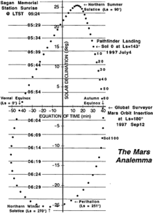 Так само, як і на Землі, на Марсі практикується свій варіант вирівнювання часу, яке полягає у відображенні різниці між сонячним часом та точним (годинниковим) часом. Вирівнювання часу ілюструється аналемою. Через ексцентриситет орбіти, тривалість сонячної доби є не зовсім постійною. А зважаючи на те, що орбітальний ексцентриситет Марса є більшим, аніж ексцентриситет Землі, тривалість доби відхиляється від середнього значення значно сильніше, аніж на Землі, а тому й вирівнювання часу тут демонструє значно сильніші варіації, аніж на Землі: на Марсі Сонце може рухатись по небосхилу на 50 хвилин повільніше, або на 40 хвилин швидше порівняно з часом, який показує марсіанський годинник (на Землі відповідні цифри становлять 14 хвилин 22 секунди відставання та 16 хвилин 23 секунди пришвидшення).