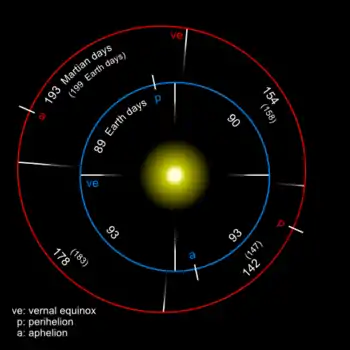 Марс має нахил осі та період обертання, подібні до земних. Тому на планеті бувають майже такі ж, як і на Землі, пори року — весна, літо, осінь та зима, а тривалість дня є наближеною до земної. Однак тривалість року на Марсі є майже вдвічі довшою, ніж на Землі, а ексцентриситет орбіти — значно більший, а це, між іншим, означає, що тривалість різних пір року на Марсі може дуже відрізнятись, а сонячний час може відхилятись від годинникового часу значно помітніше, ніж на Землі.