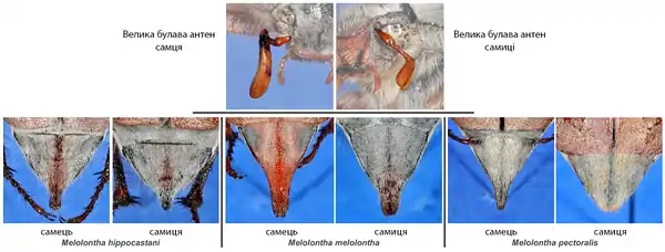 Антени у самця з великою булавою з 7 пластин, у самиці — з 6 дрібніших і коротших пластин. Пластини містять нюхові рецептори, які дозволяють самцю знаходити самицю. Пігідій самця має довгий і вузький відросток, у самиці коротший.