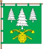 На квадратному зеленому полотнищі три білих ялини, середня вища, під якими два жовтих козацьких пістоля, покладених навхрест, поверх яких жовта порохівниця.