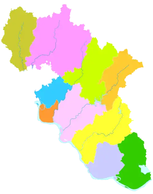 Міський округ поділяється на 1 район, 2 міських повіти й 7 повітів: