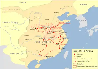 Залишки війська Ван Сяньчжи приєдналися до загонів Хуан Чао. Усі прихильники повстання приходили тепер лише до нього, через це чисельність його армії досить швидко зростала. Один із його сподвижників Шан Жан привселюдно проголошує Хуан Чао — Хуан ваном (правителем Хуаном). Через це, згодом він отримав ще один «титул» — Чун Тянь да цзянцзеюнь (Великий полководець, що штурмує небо). Дослідники вважають, що саме з цього моменту Хуан Чао починає свій рух до імператорського престолу[8]. Приблизно тоді ж з'являються перші спроби створювати нові органи влади на підконтрольних територіях та дисциплінувати армію, але вони не увінчалися успіхом. У 879 році після перегрупування своїх військ Хуан Чао вирушає на південь, до території сучасних провінцій Чжецзян, Фуцзянь и Гуандун. Усі гарнізони імператорської армії, що траплялися на дорозі повстанцям, були знищені. Багато солдат повставали проти своїх офіцерів і переходили на сторону Хуан Чао. Восени 879 року після жорстокого штурму повстанці захопили Гуанчжоу. Ватажок повстання надав собі ще один титул — «Великий полководець Піднебесної» У місті на той час було багато іноземних купців, які ворожо поставилися до військ Хуан Чао. Це викликало багато конфліктів, що переросли в розбої та грабежі. Велика кількість арабських, перських та єврейських торговців постраждали від цього. На той час армія повстанців нараховувала півмільйона чоловік. Проте згодом почалася епідемія малярії, яка винищила майже 40 % війська. Через це Хуан Чао зазнав поразки у битві під Саньяном в провінції Хубей. Повстанці відступили за Янцзи, для того аби відновити сили. У листопаді 880 року на чолі 300-тисячної армії Хуан Чао без бою захоплює столицю Лоян. Імператор зі своїми військами евакуювався до Чан-аню за кілька днів до цього. Такий крок був зумовлений тим, що полководці імператорської армії не очікували, що повстанці за такий короткий період часу відновлять свої сили, і саме тому на оборону столиці залишили лише кілька тисячне військо. Жителі Лояну зустріли Хуан Чао із дарунками, навіть намісник вийшов привітати його та передати йому владу. Після взяття міста повстанці розпочали репресії проти чиновників та імператорських друзів і родичів. Майно багатіїв роздавали біднякам. Нижчу та середню ланку чиновництва залишили живими, але в обмін на майно. Через 2 місяці Хуан Чао із військом вирушає на Чан-ань. Оборонці фортеці Тунгуань, що мала затримати його та не дати пройти до нової столиці, здалися без бою. 10 січня 881 року повстанці захоплюють Чан-ань. Імператор втік до Сян'янь, а потім до Сичуань. У захопленому місті розпочалися розбої та мародерство. Чиновників вирізали, їхні будинки палили, жінок ґвалтували. Хуан Чао проголосив себе імператором нової династії Та Ци (Велика Ци). Своїм гаслом він обрав вислів «золоте правління». Після цього нових військових походів він не здійснював, не намагався захопити Сичуань та остаточно утвердитися на троні. Вважається, що так сталося через те, що він не мав остаточної програми. Його друзі отримували посади міністрів та коштовні подарунки, накопичували багатство, оскільки вважали, що Танська династія не зможе відвоювати Чан-ань[9].