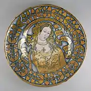 Кераміка Дерути. Таріль, розписана люстром з жіночою фігурою у центрі, до 1520 р., Художній музей Волтерс, США.