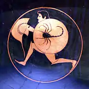Килик з вояком під час бігу, Червонофігурний вазопис. 510-520 рр. до н. е.